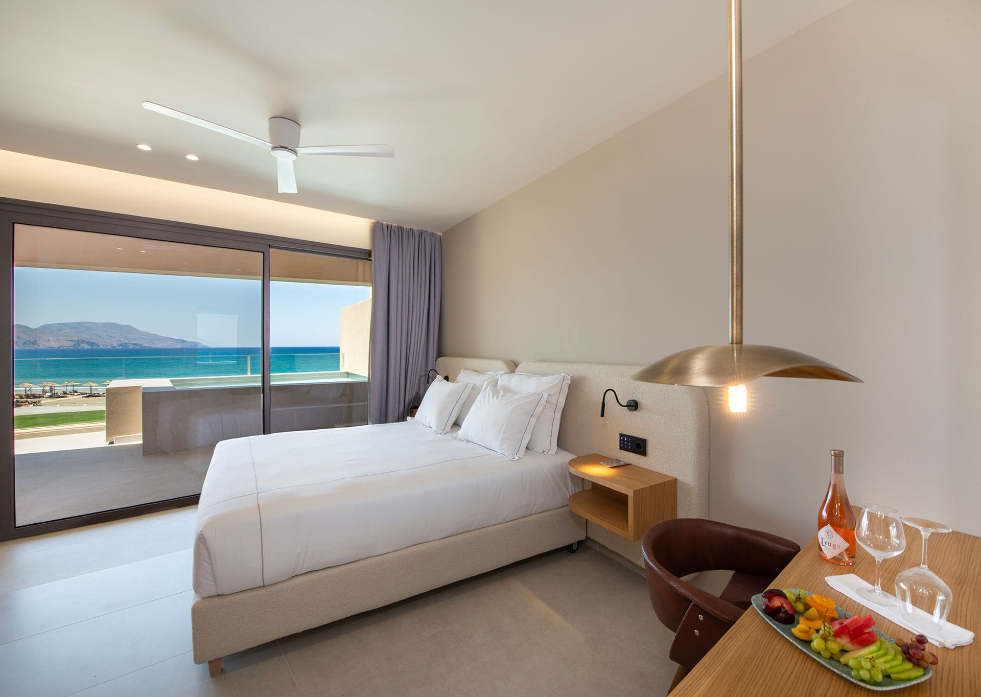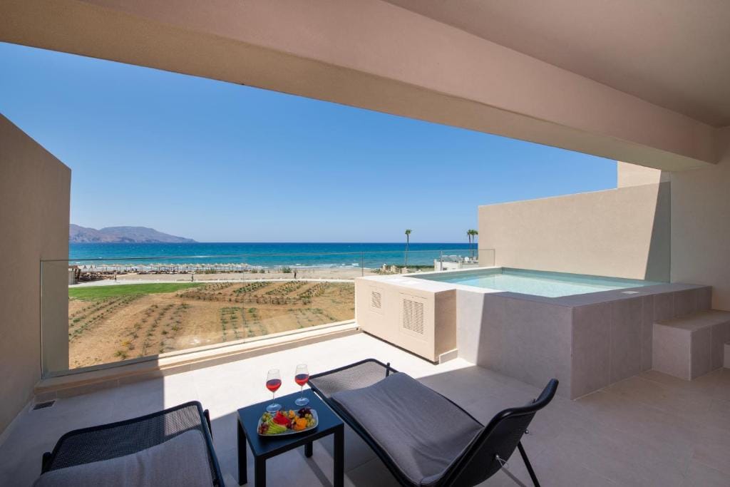 Combining luxury and infinite space 45-49m2, the Infinity Suites can accommodate 3-4 people in absolute comfort. The suite is open plan and consists of a spacious bedroom with a king size bed, a living room with one or two large sofa beds, and a terrace or balcony leading straight to the infinity pool. Also, infinity suites offer a dining area and a spectacular view of Georgioupolis Bay. A maximum of 4 persons can be accommodated in this room type.
