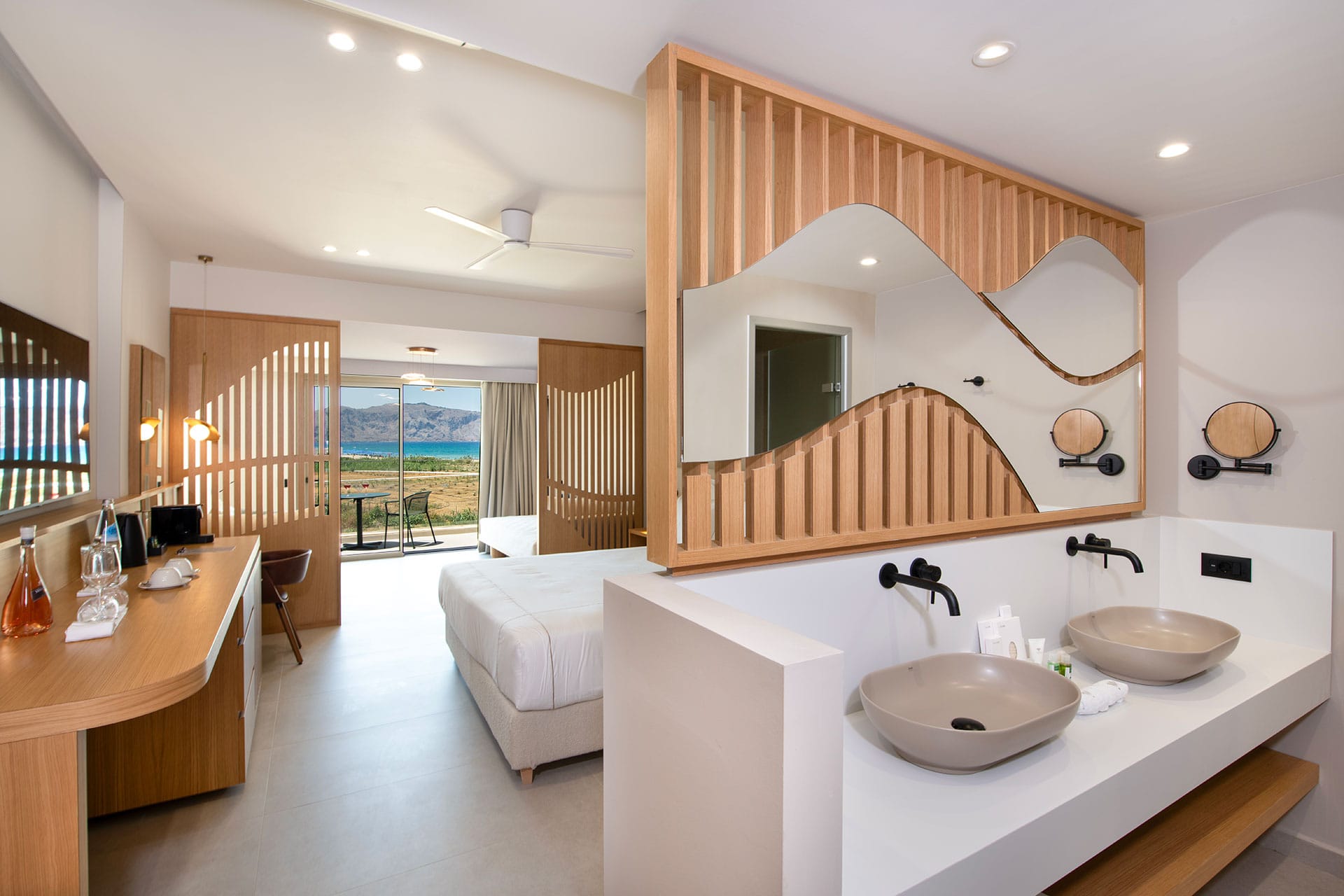 The size of the suite is 35,5-39 sq. m. The suite is open plan, and consists of a spacious bedroom with a king size bed, a living room with one or two sofas, and a terrace or balcony. The swim up suites have a private pool in the balcony.
